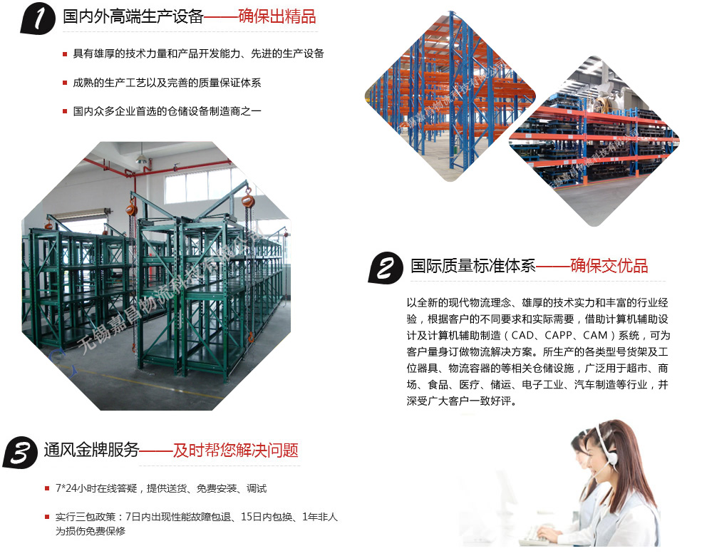 無(wú)錫嘉昌倉(cāng)儲(chǔ)貨架有限公司是國(guó)內(nèi)現(xiàn)代倉(cāng)儲(chǔ)物流技術(shù)開發(fā)、設(shè)計(jì)、生產(chǎn)和安裝的專業(yè)廠家,具有雄厚的技術(shù)力量和產(chǎn)品開發(fā)能力、先進(jìn)的生產(chǎn)設(shè)備、成熟的生產(chǎn)工藝以及完善的質(zhì)量保證體系。公司始終“以質(zhì)量求生存,以信譽(yù)求發(fā)展的”的經(jīng)營(yíng)理念,放眼世界,積極引進(jìn)、吸收國(guó)際物流行業(yè)先進(jìn)技術(shù),憑借專業(yè)的制作經(jīng)驗(yàn)、優(yōu)秀的產(chǎn)品質(zhì)量,是國(guó)內(nèi)眾多企業(yè)首選的倉(cāng)儲(chǔ)設(shè)備制造商之一。